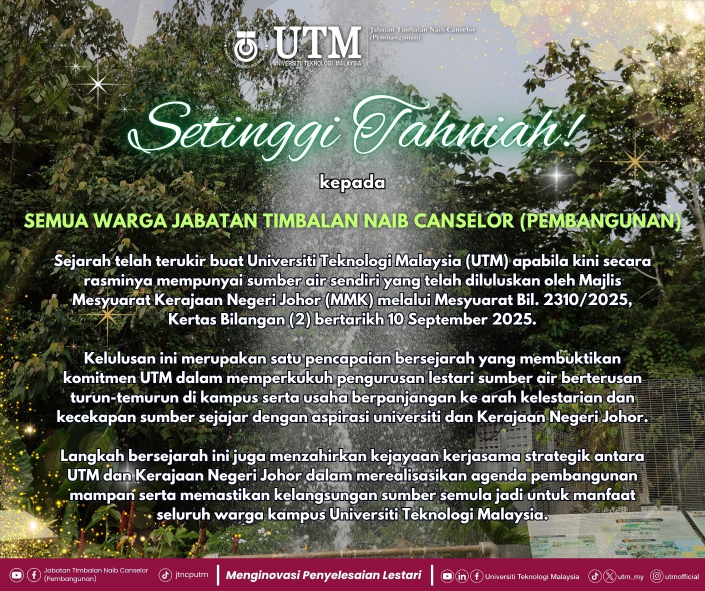 Jabatan Timbalan Naib Canselor (Pembangunan) mengucapkan setinggi-tinggi tahniah kepada seluruh warga jabatan TNC(P) atas pencapaian bersejarah Universiti Teknologi Malaysia (UTM) yang kini secara rasminya mempunyai sumber air sendiri berterusan turun-temurun dari telaga akuifer UTM dimana ia telah diluluskan oleh Majlis Mesyuarat Kerajaan Negeri Johor (MMK) melalui Mesyuarat Bil. 2310/2025, Kertas Bilangan (2) bertarikh 10 September 2025.